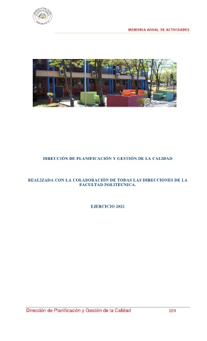 MEMORIA ANUAL DE ACTIVIDADES DIRECCIÓN DE PLANIFICACIÓN Y GESTIÓN DE LA CALIDAD REALIZADA CON LA COLABORACIÓN DE TODAS LAS DIRECCIONES DE LA FACULTAD POLITECNICA. EJERCICIO 2021 Dirección de Planificación y Gestión de la Calidad 224