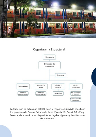 La Dirección de Extensión (DEXT), tiene la responsabilidad de coordinar los procesos de Cursos Extracurriculares, Vinculación Social, Difusión y Eventos, de acuerdo a las disposiciones legales vigentes y las directivas del decanato.