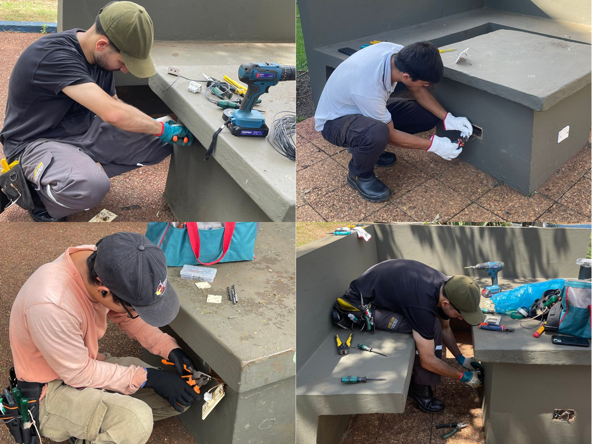 En el marco de los proyectos de extensión universitaria, estudiantes de la carrera de Ingeniería Eléctrica, bajo la supervisión y acompañamiento del docente de la cátedra Electricidad Básica y coordinador académico, Ing. Héctor Ferreira; del coordinador de laboratorio, Ing. Víctor Chanel, y del docente de extensión universitaria, M.Sc. Juan Carlos Pitta, llevaron a cabo el proyecto denominado “Reparación y Mantenimiento Eléctrico en la Poliplaza y Aulas” de la Facultad Politécnica.