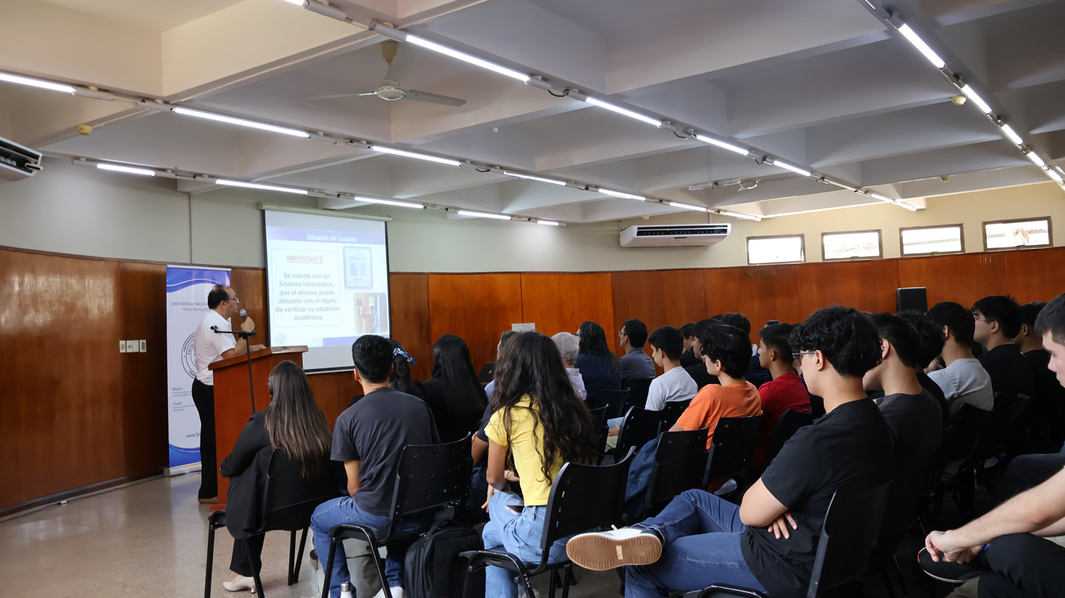 La jornada se desarrolló en dos momentos. En primer lugar, la orientación estuvo dirigida a los ingresantes de las carreras de Ingeniería de Sistemas e Ingeniería Eléctrica. Tras la recepción de alumnos y autoridades, el Decano, Ing. Walter Isabelino Duarte Maldonado, ofreció las palabras de bienvenida, destacando el compromiso institucional con la formación científica y tecnológica.