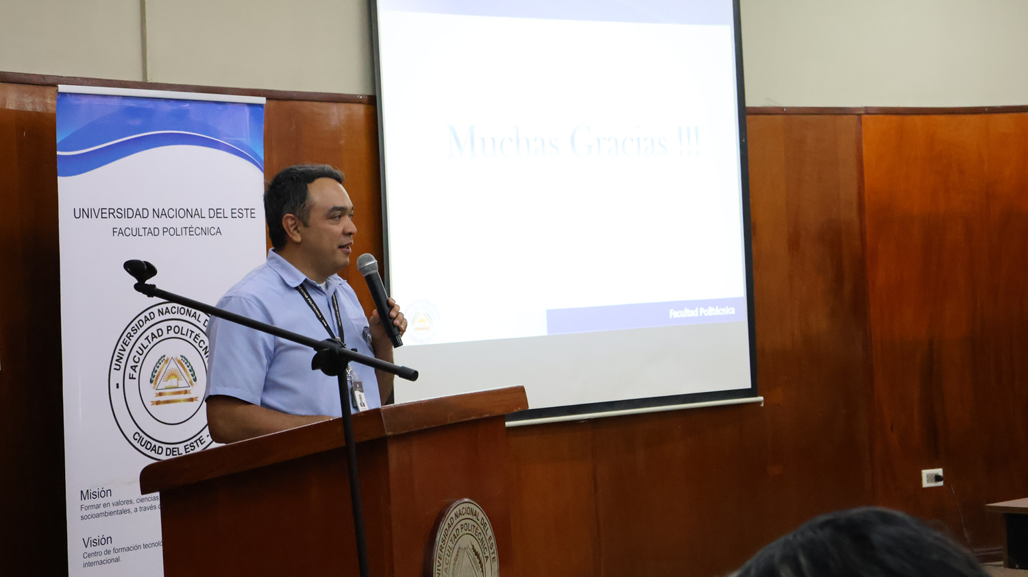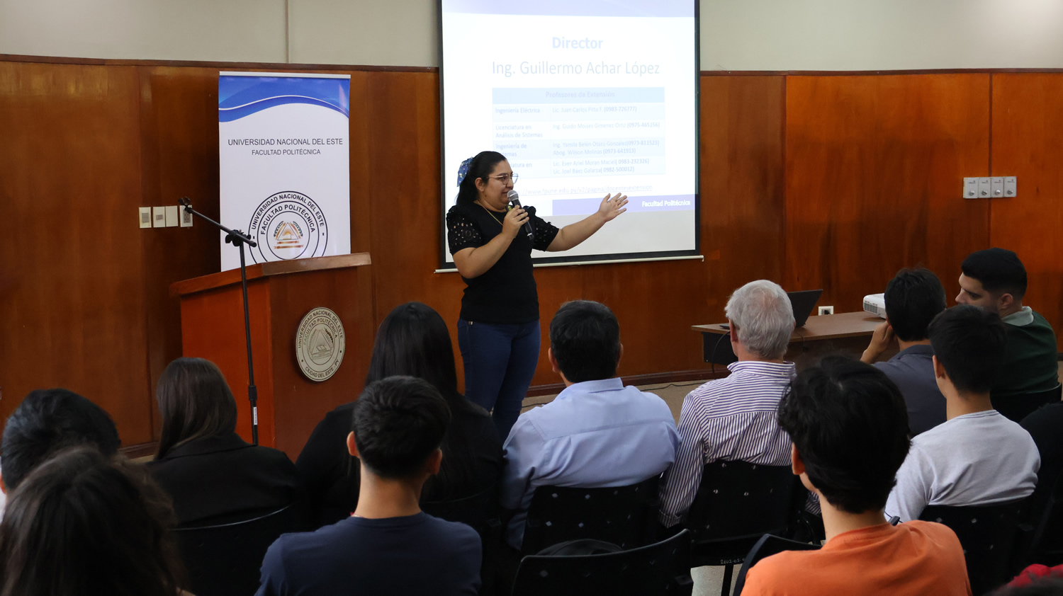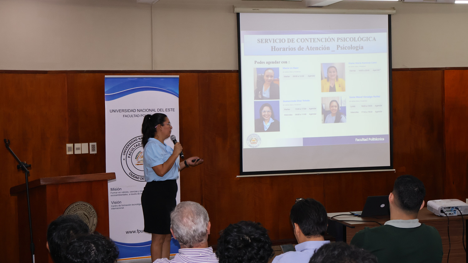 Posteriormente, los coordinadores de carrera, la Ing. Mirta Arrúa, de Ingeniería de Sistemas, y el Ing. Joel Ferreira, de Ingeniería Eléctrica, brindaron informaciones académicas relevantes para el inicio de la vida universitaria, abordando aspectos organizativos, académicos y formativos.